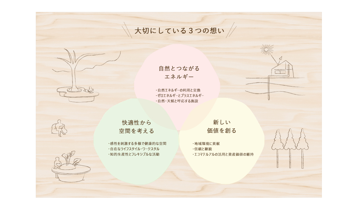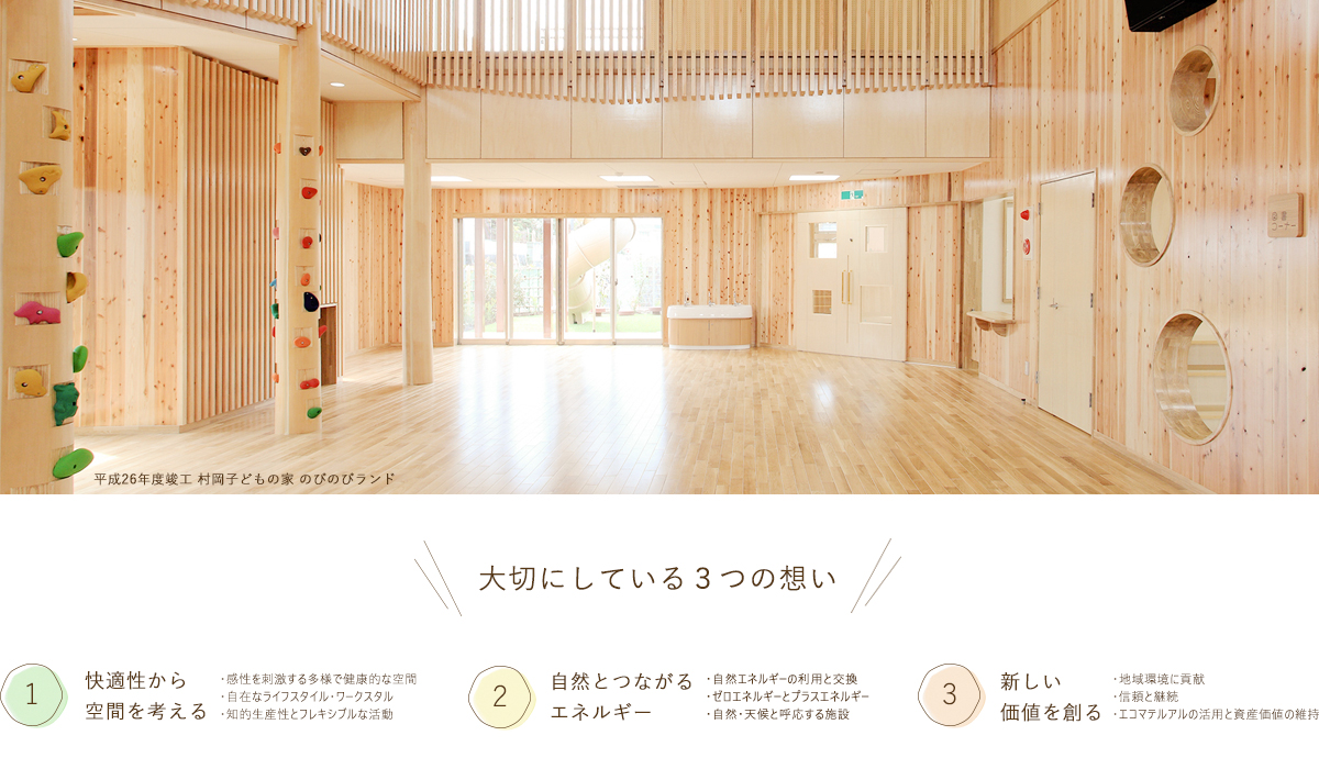 わたしたちは、生き生きと活動できる空間を創造し未来へ繋げています。 環境性能をカバーし穏やかな自然光や通風を内部へ取り込み、体内リズムの改善、メンタルヘルスの向上を計る空間設計を行います。