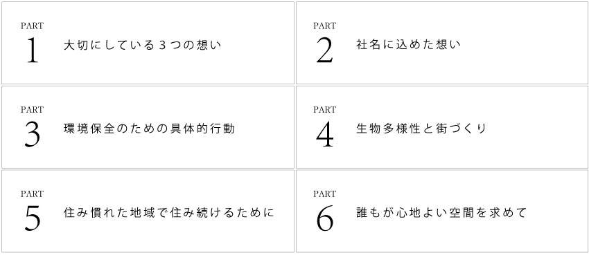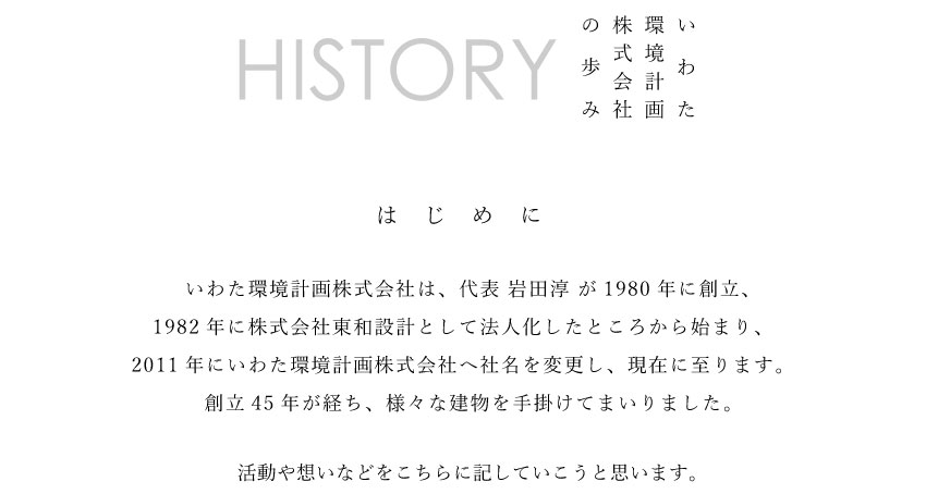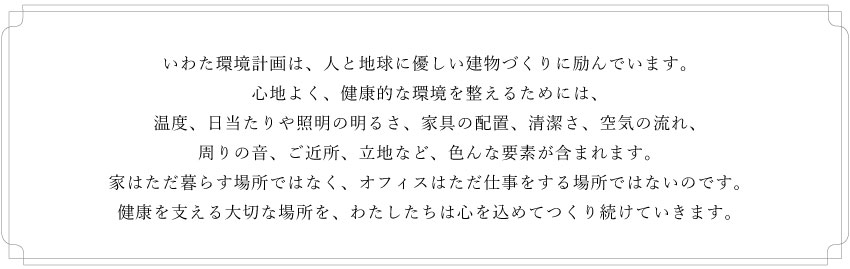 「いわた環境計画」は、創業当初から注力してきた“環境を整える”を、社名に反映しました。そして、現在だけでなく未来も見据えた環境計画を提供できる会社でありたいという想いを胸に、お客様のパートナーとしての責任、今後移り変わる環境と共に成長し、社会に貢献していきます。