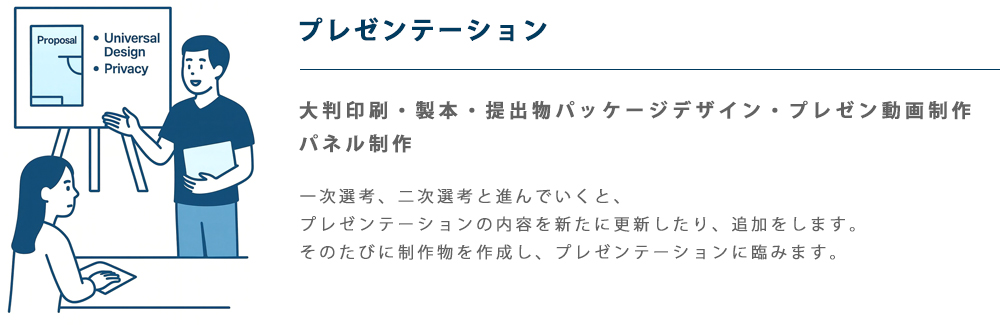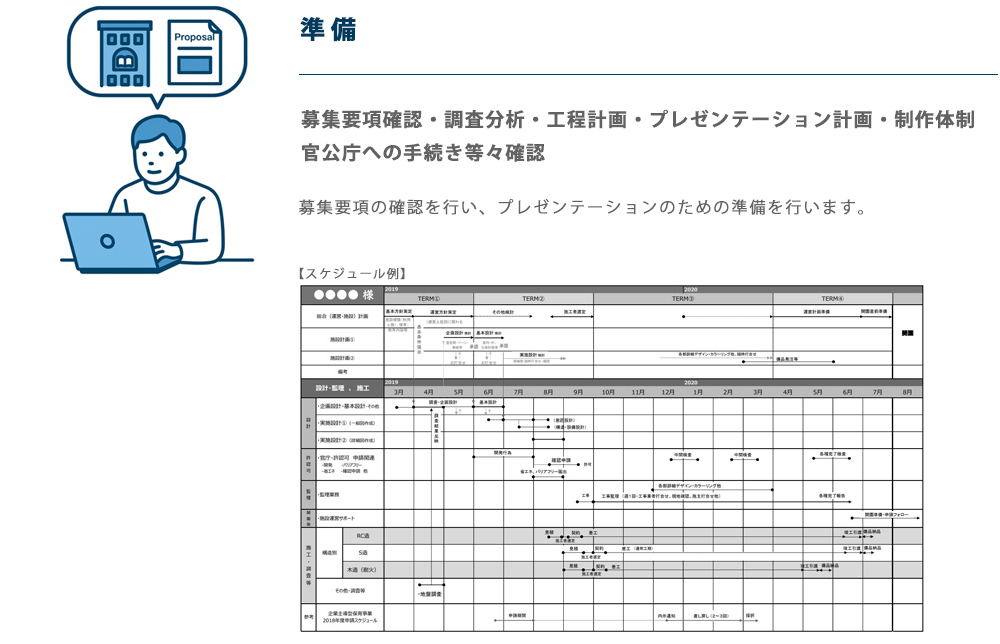 環境に合わせた最適な設計、空間の仕組みづくり、建物の設備や電気の省エネ計画、人の動線のデザインだけでなく、建物の収支計画までを総括してご提案いたします。価格競争ではなく、提案の内容や実現性を重視する、公募型プロポーザルなどへ参加し、構想や企画から建物をつくりだします。
